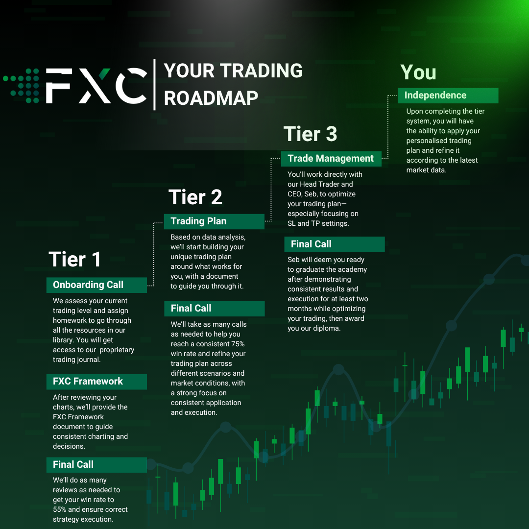 That’s exactly why, in our Gold Membership, we provide you with a step-by-step trading roadmap that outlines your entire journey, from onboarding to independence. Just like the FXC Trading Roadmap, you’ll always know what comes next, what to focus on, and how your growth unfolds.